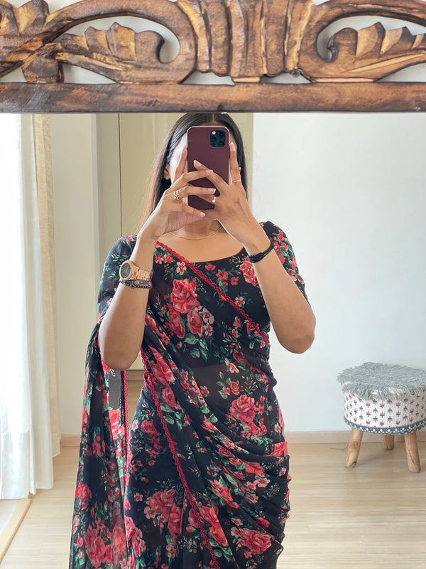 Experience effortless elegance with our Black Floral Printed Ready-to-Wear Saree, designed especially for today’s modern women. This stitched saree is perfect for those who love the charm of traditional drapes but prefer the convenience of ready-to-wear styling. No more lengthy draping – just slip it on and you’re ready to shine at weddings, parties, festivals, or office events.